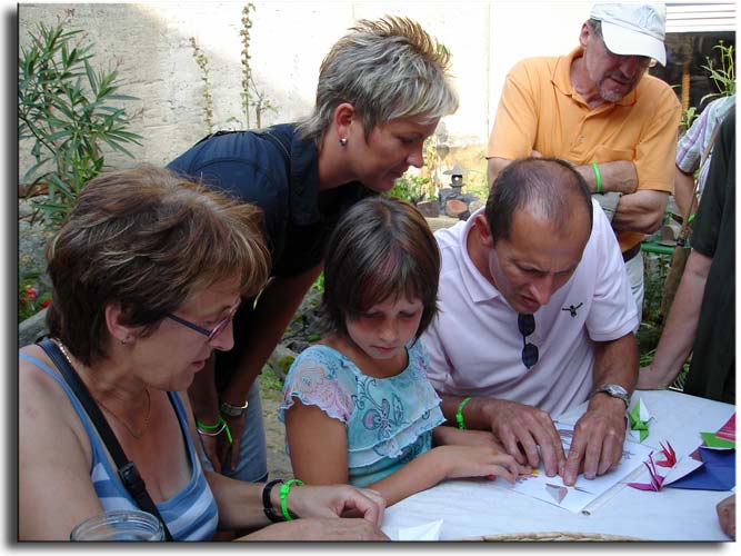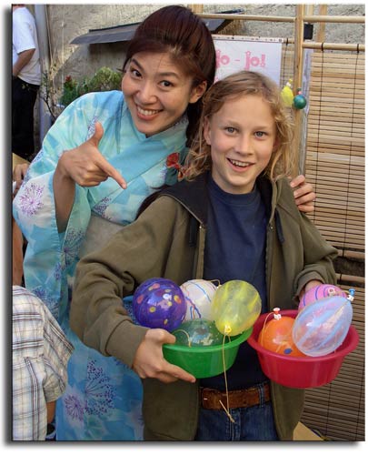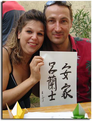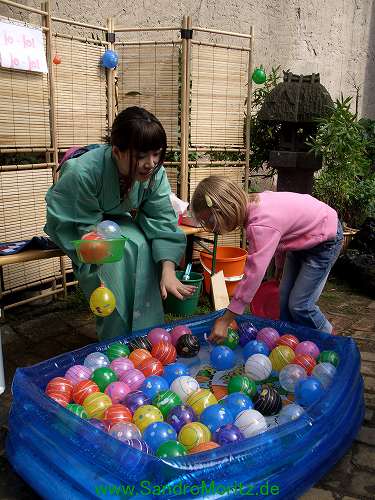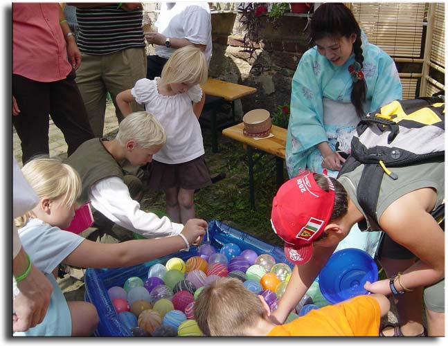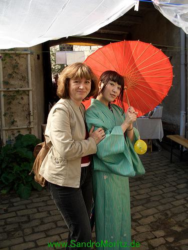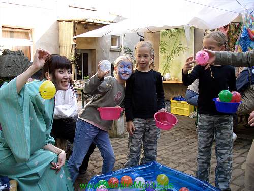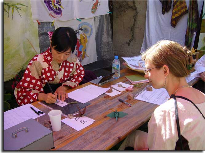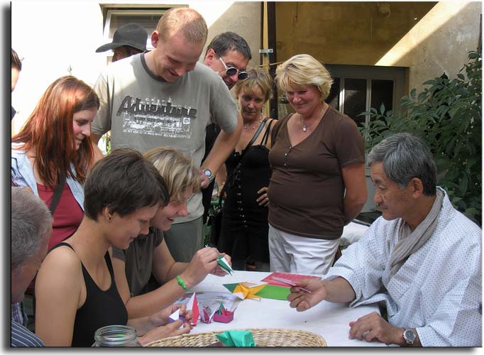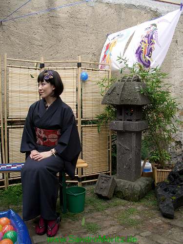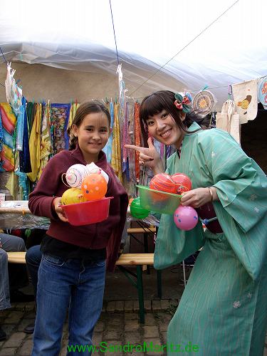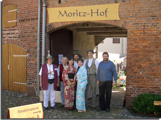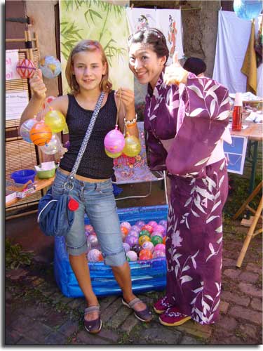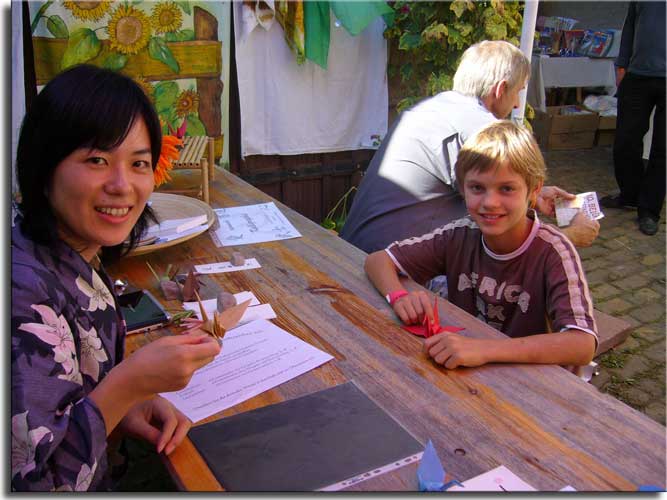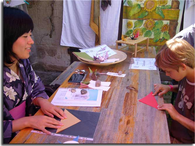 | Auch 2007 waren wir wieder mit unseren MORITZ-HOF beim Altstadtsommer vertreten. Als Besonderheit hatten wir in diesem Jahr Herrn Inuoe und Frau Kunitake bei uns zu Gast. Herr Inoue erklärte den Gästen die japanische Kunst des Papierfaltens -ORIGAMI- und bei Frau Kunitake konnten sich die Gäste ihren Namen auf japanisch schreiben lassen. Des weiteren hatten wir auch wieder das japanische Yo-Yo Spiel dabei, sowie eine Ausstellung von japanischen Steinlaternen, Bastelbedarf für groß und klein, Seidenmalerei und musikalische Begleitung. Hier finden Sie noch weitere Infos über den Altstadtsommer in Belzig. |