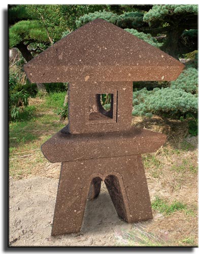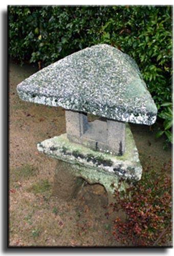 Das wohl bekannteste Beispiel der Dreieck - Laterne steht rechts am Eingang zu dem Shōiken 笑意軒 - Teehaus auf dem Gelände der Katsura Imperial Villa 桂離宮 in Kyōto. Diese Steinlaterne wird als eine Sonderform des Yukimi - Typs eingeordnet und besteht nur aus vier Teilen (Schirm 笠, Lichtkasten 火袋, Mittelplatte 中台, Fuß 脚). Das Original ist nur ca. 92 cm hoch. |