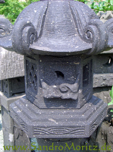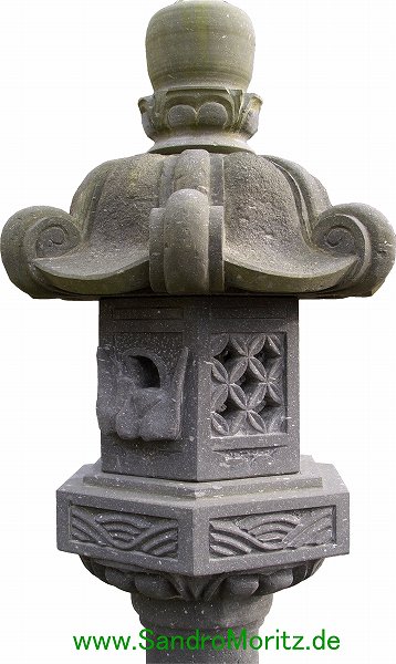 Die Kasuga - Steinlaterne zählt zu einer der bekanntesten Steinlaternen nicht nur in Japan. Sehr viele Touristen bestaunen jedes Jahr die ca. 2000 Steinlaternen auf dem Weg zum Kasuga Taisha Schrein in Nara. Nur Steinlaternen die nach den Regeln dieses Scheines hergestellt werden, tragen den Namen Kasuga - Laterne. Unter anderem ist auch der Lichtkasten mit seinen Elementen und dessen Reihenfolge in dieser Regeln enthalten. Die wohl bekanntesten Elemente sind der Hirsch und der Berg Mikasa (heute Wakakusa = Berg mit drei Gipfel). |