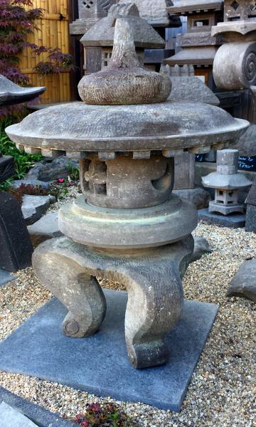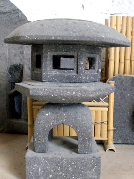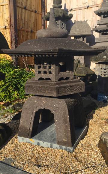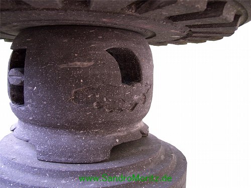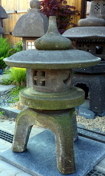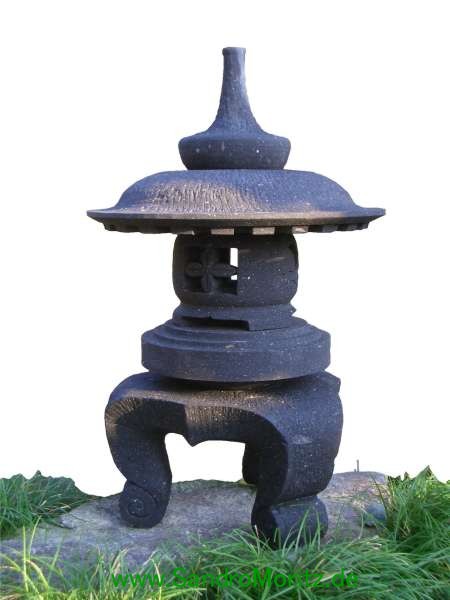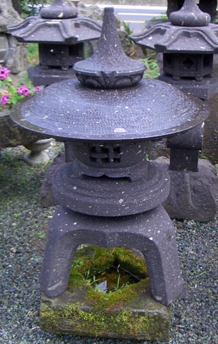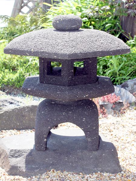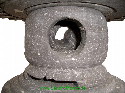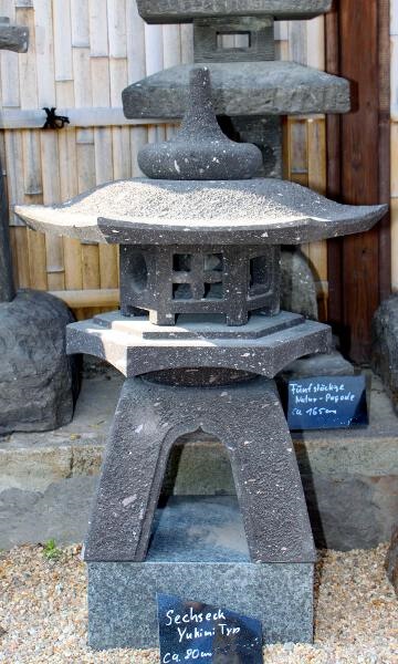 Zur Namensgebung der Yukimi - Steinlaterne gibt es zwei Ursprünge. Der wohl bekanntere Ursprung ist der, dadurch dass sich auf dem relativ breitem Schirm der Laterne der Schnee (auf japanisch Yuki 雪) gut sammelt und dieser gut sichtbar ist (mi 見), daraus der Name Yukimi gebildet wurde. Der zweite auch der wahrscheinlichere Ursprung kommt von einem Namen eines Gebäudes in Tempelanlagen. Dieses Gebäude steht im Wasser und spiegelt sich auch gut darin. Diese Spiegelung und auch der Name des Gebäudes wird auf Japanisch als Ukimi (浮見) bezeichnet. Die Yukimi - Laterne soll nach diesem Ursprung her dieses Tempelgebäude darstellen. Aus diesem Grund wird üblicherweise der Standort der Yukimi - Laterne so gewählt, dass sich eine schöne Spiegelung der Laterne im Wasser bildet. Die Yukimi - Laterne gibt es in vielen verschiedenen Ausführungen. Von rund, drei-, vier-, sechs- und achteckig, mit geraden und geschwungenen Füßen, ganz schlicht oder mit vielen Schmuckelementen. |