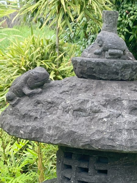 Bei älteren Steinlaternen können altersbedingt leichte Schadstellen und materialtypische Ausblühungen vorhanden sein, wodurch diese Steinlaterne ihr einmaliges Aussehen erhält.
