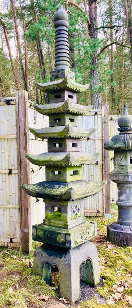 Die berühmten japanischen Holzpagoden in Nara und Kyoto sind wohl fast jedem bekannt. Die elegante Grundform dieser historischen Holzpagoden findet sich auch in der Gestaltung der fünfstöckigen Pagoden-Steinlaternen wieder. Durch das leicht geschwungene Dach und die schlanke Form strahlt diese Steinlaterne eine besondere Eleganz aus. Der unterste Lichtkasten ist mit einem Schmuckfenster in Form eines Blumendesigns versehen, während die anderen Lichtkästen und Seiten schlicht rechteckig gearbeitet sind. Der Boden der einzelnen Lichtkästen und Schirme ist so gestaltet, dass sie mit ihren Öffnungen einen Lichtschacht bilden, der für eine eindrucksvolle Beleuchtung sorgt.